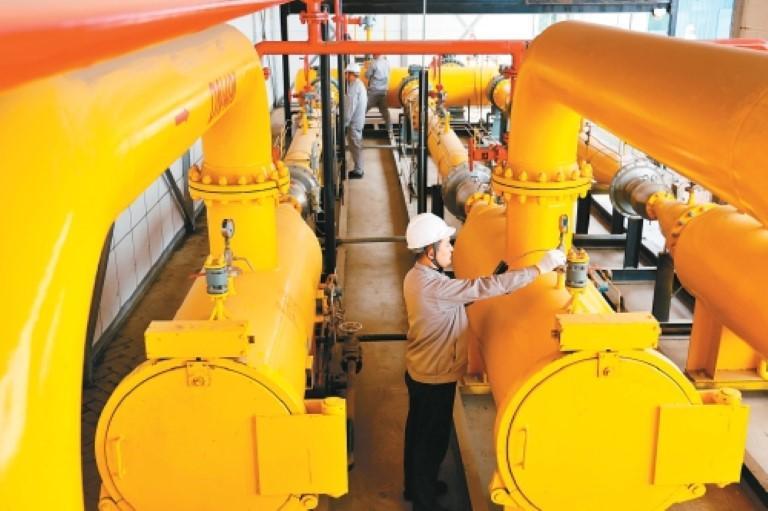 在西安热电供热有限公司天然气调压撬现场,长安天然气工作人员重点检查设备管道运行状况。