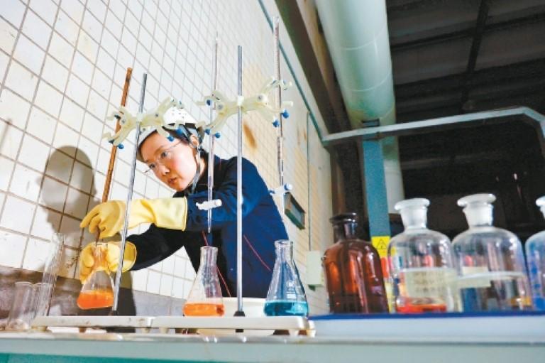 在西安市热力集团雁东供热有限公司,水质化验员对水质进行检测,查看锅炉用水是否达标。