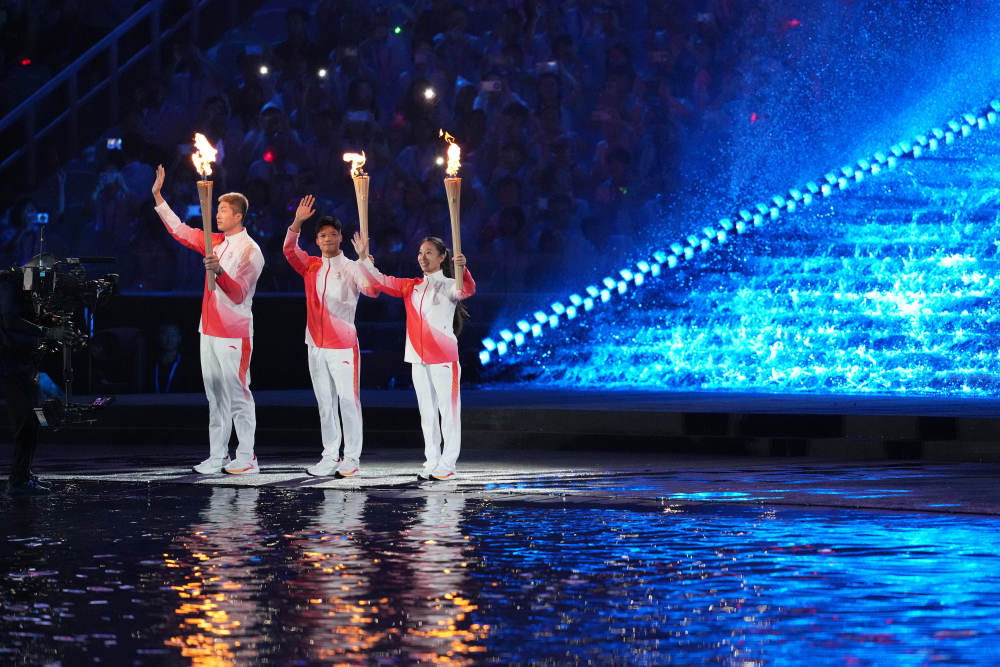 11月9日,火炬手苏炳添(中)、张家朗(左)、李祎点燃主火炬后向观众致意。新华社记者 肖艺九 摄