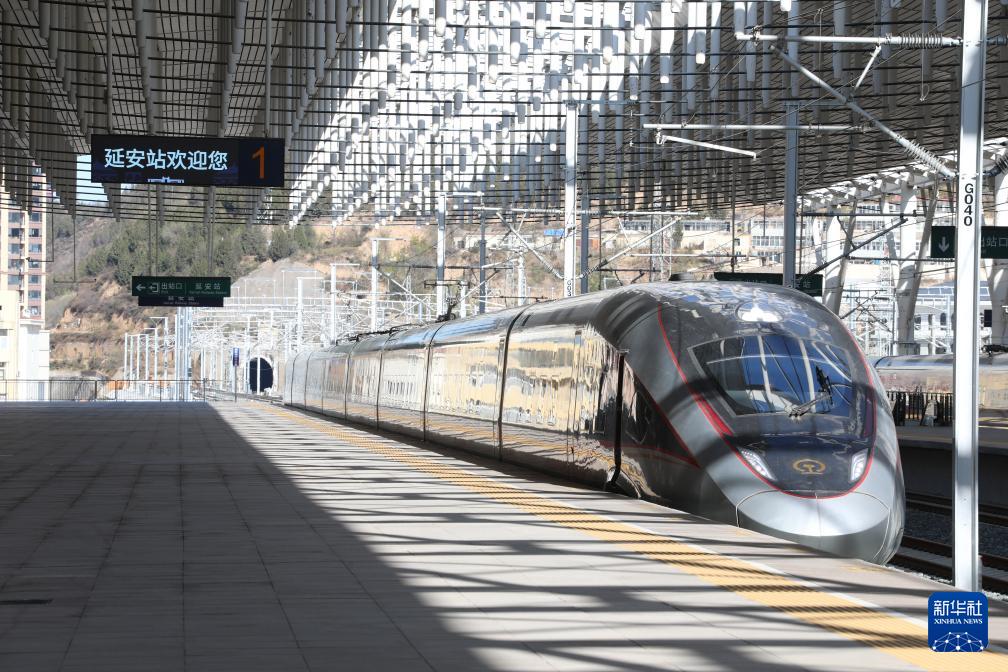 11月17日,一列试验动车组抵达延安站。新华社发(张黎芝 摄)