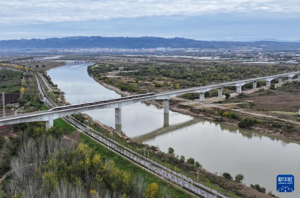 11月17日,一列试验动车组通过西延高铁渭河特大桥(无人机照片)。新华社记者 张博文 摄