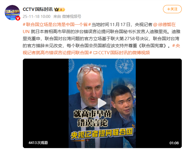 当地时间11月17日,央视记者就日本首相高市早苗的涉台错误言论提问联合国秘书长发言人迪雅里克。