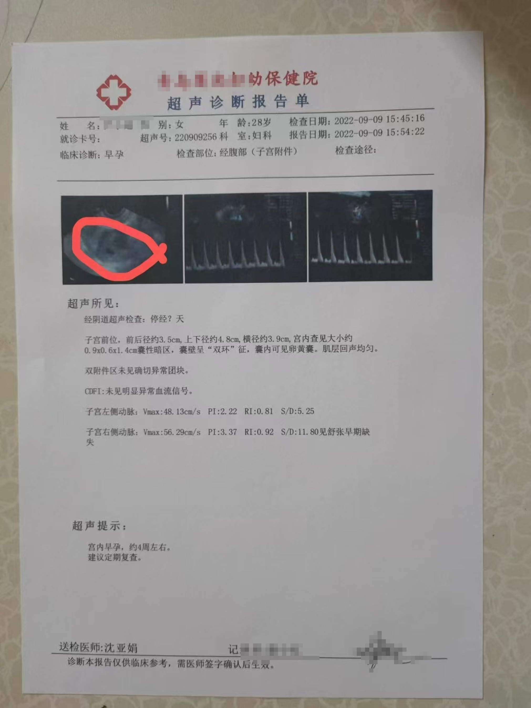 △尹霞伪造的怀孕医院报告。受访者提供。