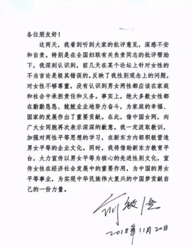 俞敏洪的道歉信。九派新闻