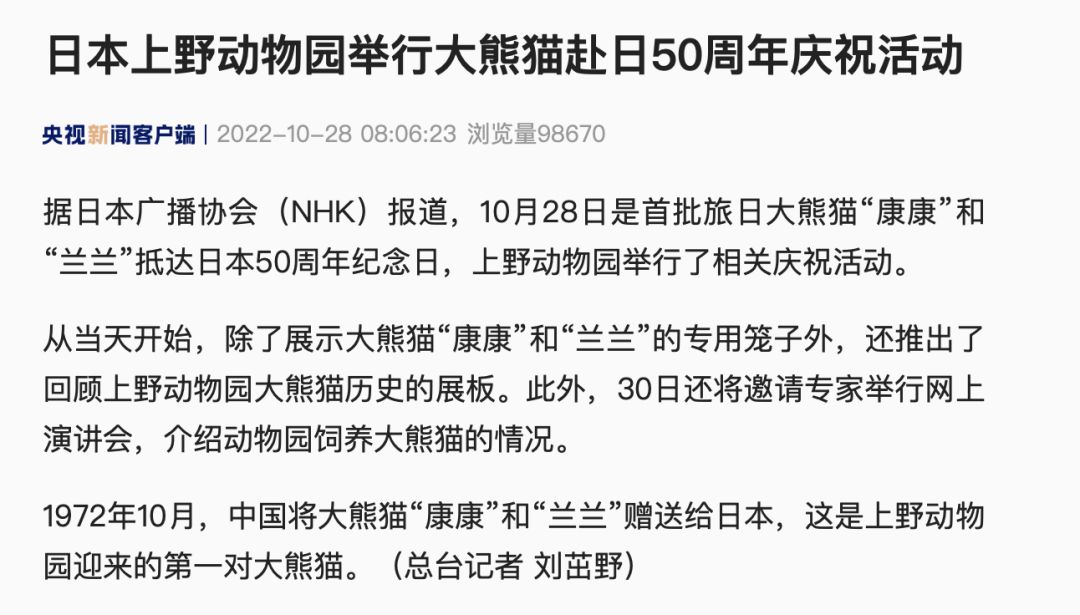 另据北京日报11月19日报道,辽宁大学日本研究中心客座教授陈洋表示,如果目前中日紧张局势持续,中方可能不再向日本租赁新的大熊猫,日本将面临全国没有大熊猫的情况。