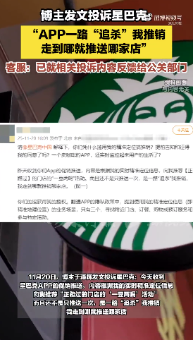 11月20日,博主于泽辉发文投诉星巴克:今天收到星巴克APP的促销推送,内容根据我的实时精准定位信息,向我推荐“正路过的门店的‘一豆两喝’活动”。而且还不是只推送一次,是一路“追杀”我推销,我走到哪就推送哪家店。你们小程序隐私政策倒是提到“展示促销活动信息”可以用定位信息,但那是我主动打开小程序的场景,不是被动接受你们的推送骚扰。