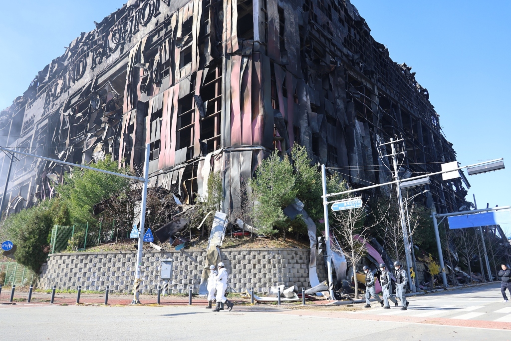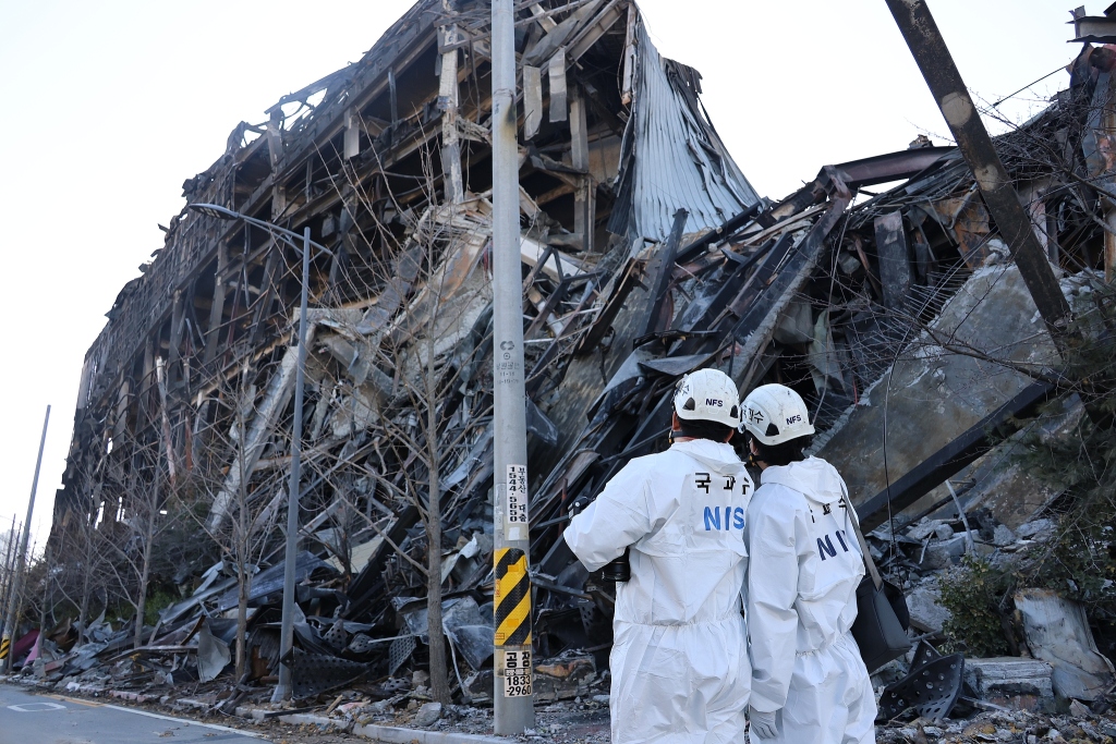当地时间2025年11月21日,韩国忠清南道天安市,消防、警察、国立科学搜查研究院等联合调查组人员对时尚物流中心火灾现场进行调查。视觉中国 图