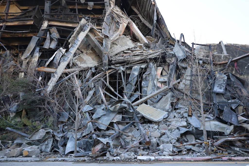 当地时间2025年11月21日,韩国忠清南道天安市,衣恋集团(E-LAND)时尚物流中心发生火灾后,建筑残骸散落在人行道上。视觉中国 图