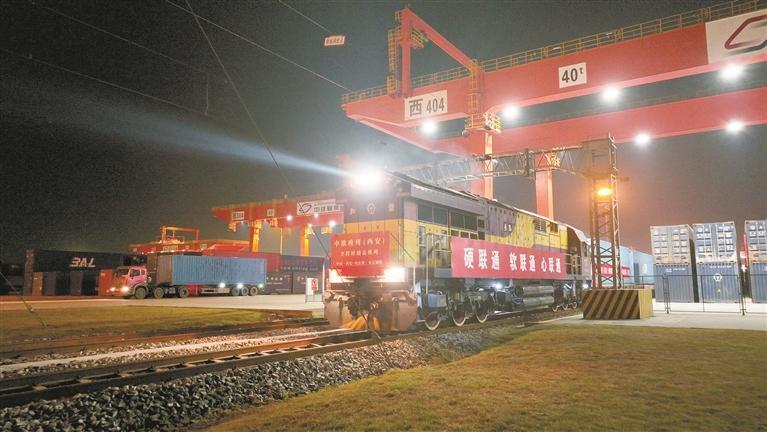 本报讯 (记者 杨光文/图)11月22日23时,满载45个集装箱货物的X8159次中欧班列从中国铁路西安局集团有限公司(以下简称“西安铁路局”)西安国际港站缓缓驶出,一路向西开往匈牙利布达佩斯。这标志着首趟全程时刻表中欧班列(西安—布达佩斯)顺利开行。西安成为全国首个实现3条全程时刻表中欧班列线路常态化开行的城市,形成每周“六去三回”的运营格局,为共建“一带一路”高质量发展提供充足的运能保障。