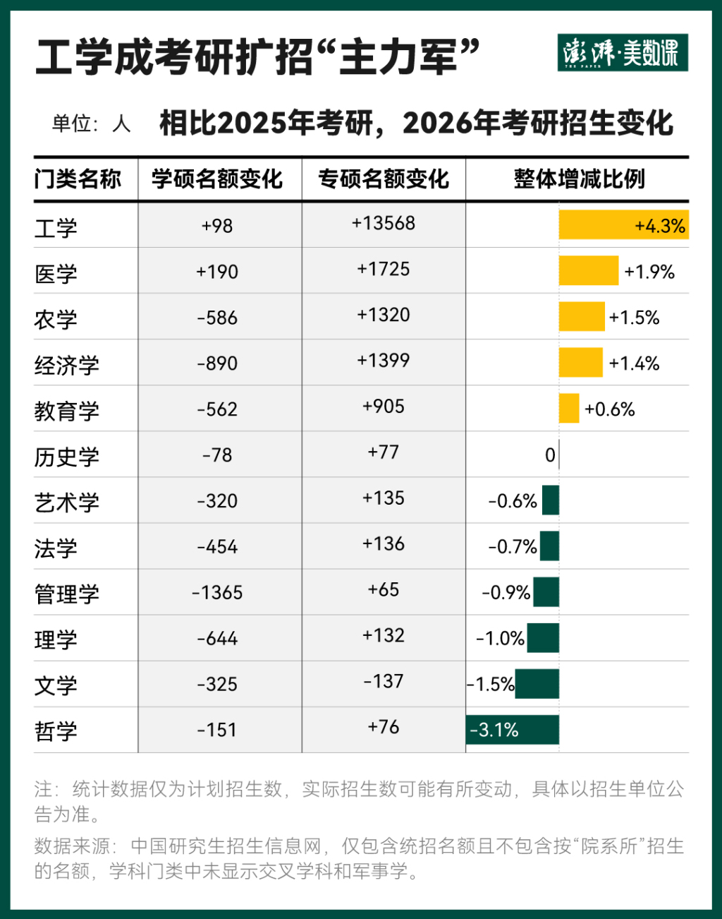 澎湃美数课基于教育部高校学生司创立的中国研究生招生信息网公布的硕士专业目录,梳理了2025年、2026年两届研究生招生计划目录中二十余万条招生信息,发现今年统招名额的扩大主要在专硕上,其中,工学类专硕名额增幅超过一万三千人,占据近三分之二的扩招名额。