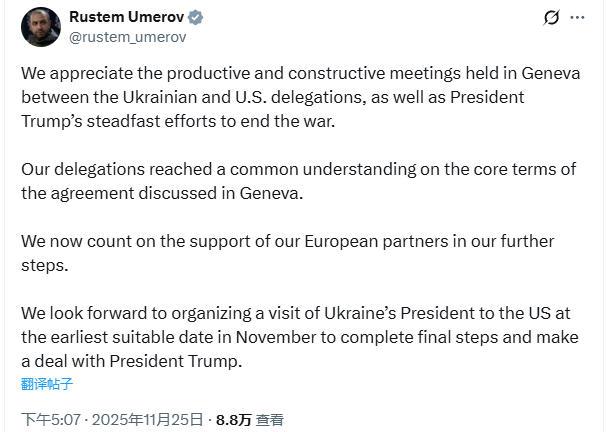 △乌克兰国家安全与国防委员会秘书乌梅罗夫25日在社交媒体上发文,称美乌双方代表团已就在日内瓦讨论的协议的核心内容上,达成一致