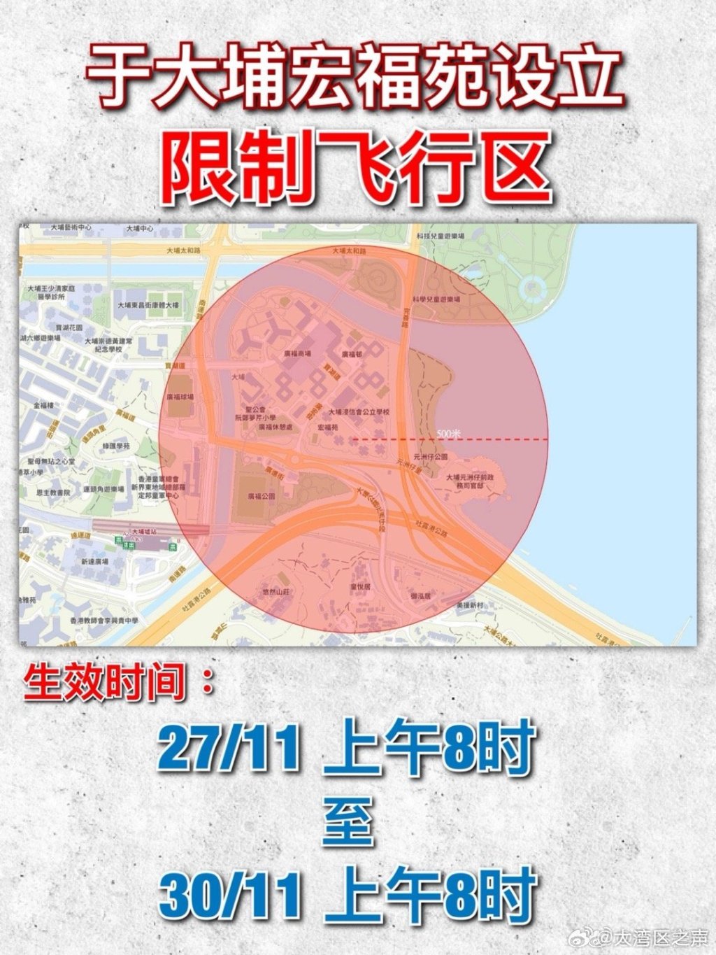 就香港大埔宏福苑发生的五级火警,为保障公众安全及确保救援工作进行,香港警务处将于该范围设立“限制飞行区”。时间为2025年11月27日上午8时至2025年11月30日上午8时。
