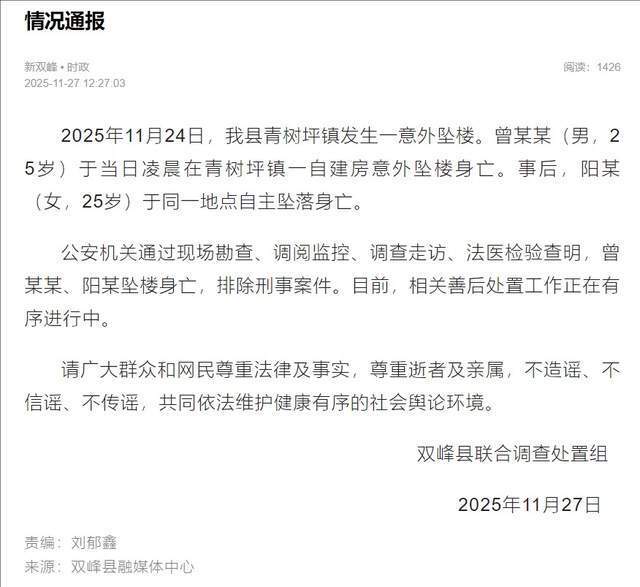 2025年11月24日,我县青树坪镇发生一意外坠楼。曾某某(男,25岁)于当日凌晨在青树坪镇一自建房意外坠楼身亡。事后,阳某(女,25岁)于同一地点自主坠落身亡。