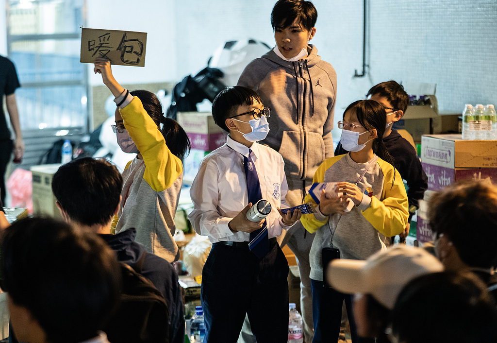 2025年11月27日晚,在香港大埔宏福苑火灾现场附近的广福邨公众活动平台一角,青少年参与为火灾受影响市民提供热水、暖包等物资帮助。图为青少年为有需要者提供帮助。 中新社记者 侯宇 摄