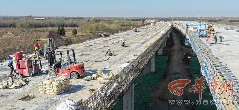 记者在鄠邑区大桥施工现场看到,巨型履带吊精准吊运着150吨重的预制盖梁,无人驾驶压路机沿着北斗定位规划的轨迹协同作业,工人们佩戴安全帽在操作台前紧盯参数,钢筋加工场里机械臂高效运转,处处是热火朝天的施工景象。
