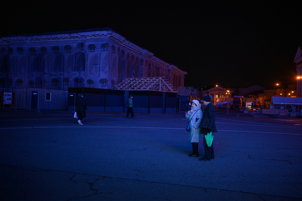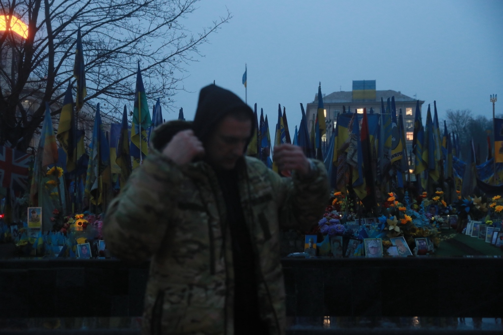 在基辅市中心克列夏季克大街、独立广场和欧洲广场,停电导致周边一片昏暗。在寒冷的阴雨中,市民们走过独立广场,神情倦怠。在独立广场西侧,一名携带行囊的乌军士兵凝视着插满悼念阵亡军人旗帜的草坪,神情茫然。“我叫基里洛·邦达连科,37岁。明天我就要重返前线,不知道是否还能活着回来。”邦达连科说。