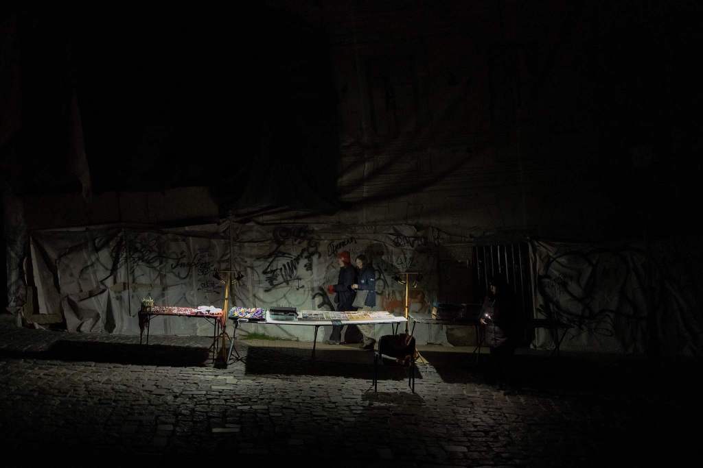 当地时间2025年11月25日,乌克兰基辅波迪尔区遭遇停电,人们走过一个亮灯的摊贩。视觉中国 图