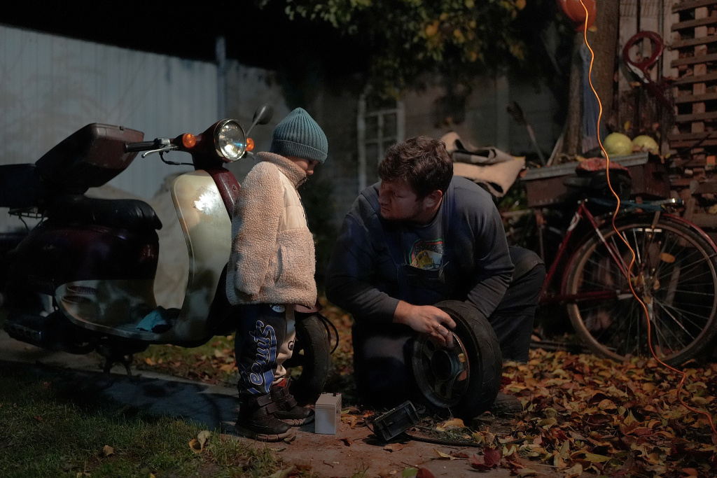 当地时间2025年10月24日,乌克兰基辅州,萨什科·亚当丘克(左)帮助父亲奥列克桑德尔修理摩托车。这辆摩托车是他们家唯一的交通工具,他们正在攒钱买一辆汽车。视觉中国 图