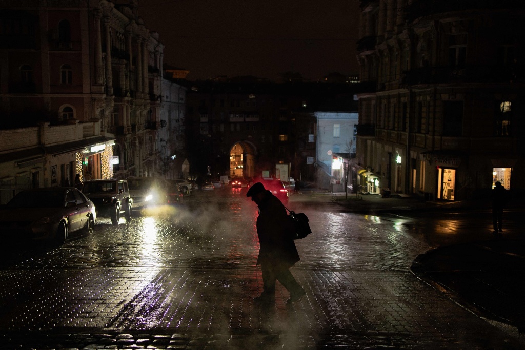 当地时间2025年11月26日,乌克兰基辅,在俄罗斯导弹和无人机袭击后,一名男子在停电期间穿过一条没有照明的街道。视觉中国 图