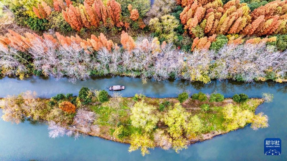 12月1日,游客乘船在江苏省兴化市李中水上森林公园赏景游玩(无人机照片)。