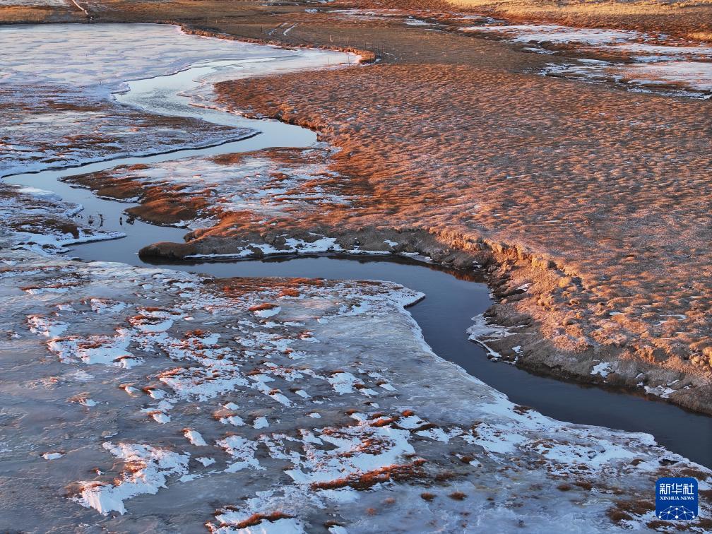 这是12月1日在甘肃省阿克塞哈萨克族自治县阿勒腾乡哈尔腾村拍摄的大哈尔腾河冬景(无人机照片)。