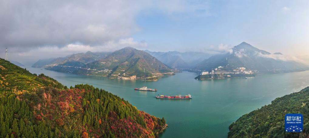 12月1日,船舶行驶在湖北省秭归县沙镇溪镇树坪村外沿水域(无人机全景照片)。