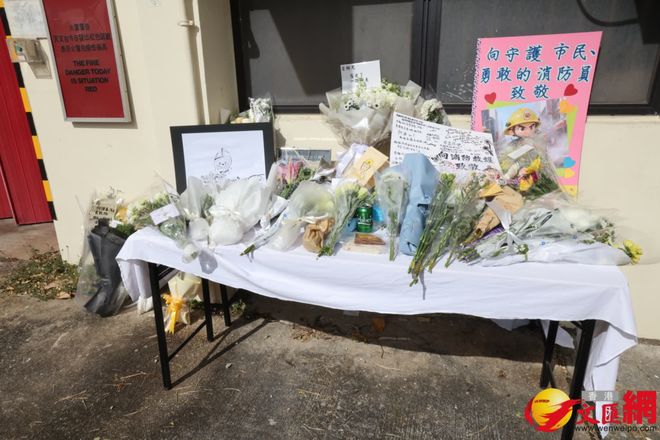消防局外设有铺上白布的桌子,让市民摆放鲜花及心意卡悼念