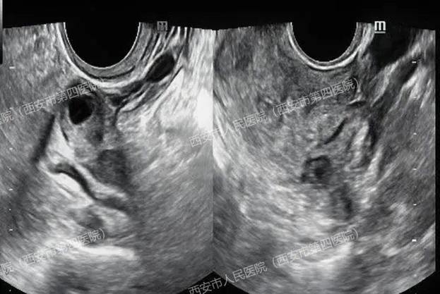 (上图腔内超声显示宫腔内未见孕囊,下图显示右侧卵巢小囊肿)