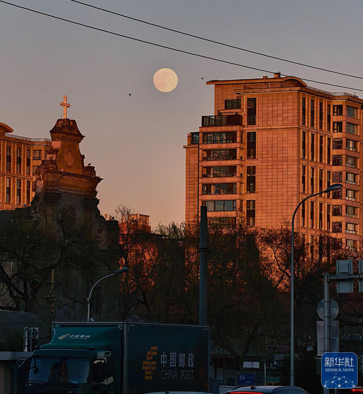 ↑ 12月4日在北京宣武门附近拍摄的月亮与一处建筑。新华社记者 张铖 摄