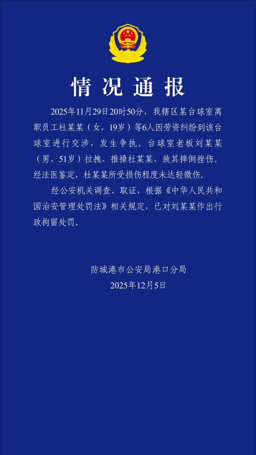 就“一台球厅管理员将讨薪女生甩抛在地”一事,防城港市公安局港口分局12月5日早上发布情况通报:
