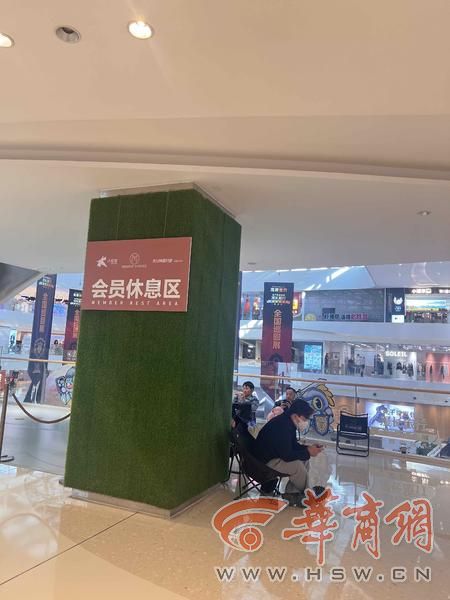 该商场设置有多处休息区域,有的是会员休息区,有的是把公共空间设计成座椅的样式,顾客逛累了可以休息。记者在会员休息区看到,不少顾客坐在摆放在休息区的露营椅上,有的在听音乐,有的在刷手机,也是难得的休闲时刻。