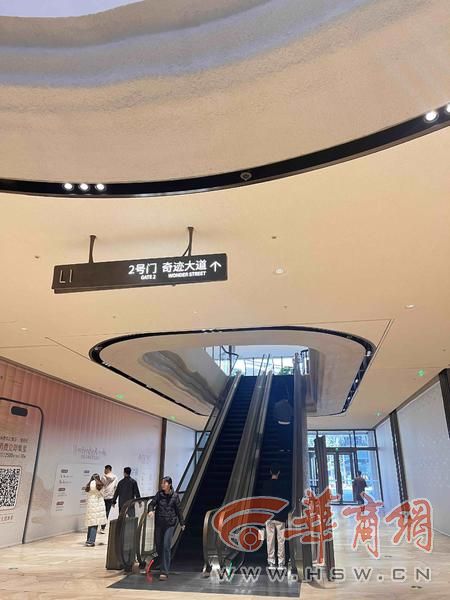 商场的电梯分为扶梯和直梯两种,扶梯在商场中间,直梯分布在两侧,都比较好找,标识也都很清晰。但是,楼梯口的指示牌同样存在字体过小、标识太密集的问题,商场内的指示牌所指的“奇迹大道”、“灵感之桥”,不熟悉的人也会找不到位置。