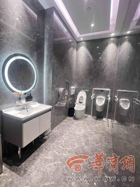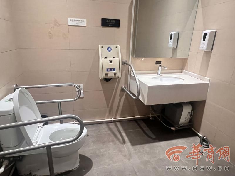 阳光天地也设有无障碍卫生间,记者在三楼的无障碍卫生间看到,该卫生间由坐式马桶和洗手台组成,马桶周围安装了扶手,洗手台一侧也有扶手,水龙头也是感应出水。