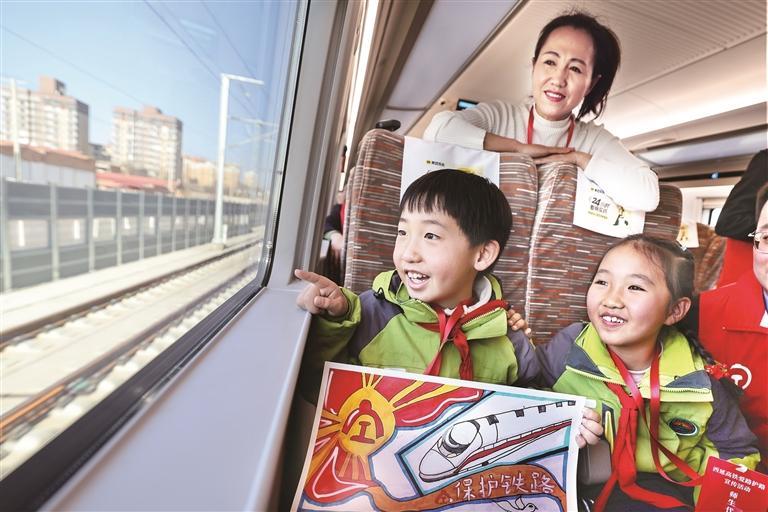 12月7日,复兴号动车组列车从延安站开车,载着“护路体验官”参加西延高铁爱路护路主题宣传活动。