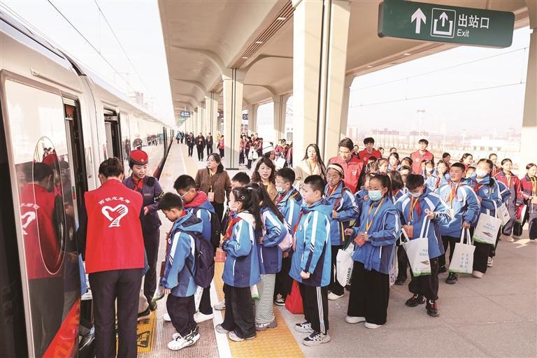 为增强沿线中小学生的爱路护路意识和铁路安全素养,西安铁路局本次特别邀请了沿线市县12所学校的310名师生代表,通过乘车体验和车站观摩两种形式让师生们沉浸式学习西延高铁安全知识。