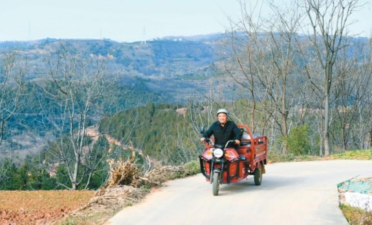 “强强”骑着他的电动三轮车行驶在蜿蜒的山路上为村民送饭。