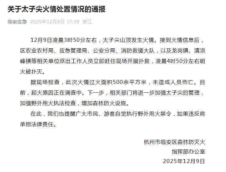 据现场检查,此次火情过火面积500余平方米,未造成人员伤亡。目前,起火原因正在调查中。下一步,相关部门将进一步加强太子尖的管理,加强野外用火执法检查,增加森林防火设施。