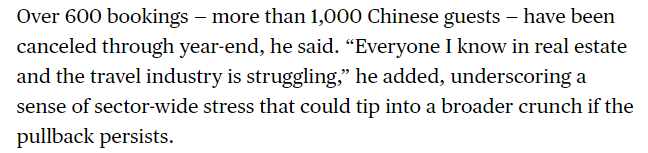 文章以一位在日本大阪市中心经营约80套度假租赁房产的旅游业从业者的经历为切入点。这位从业者表示,截至目前,已有超过600笔订单被取消,涉及1000多名中国游客。他说,“我认识的房地产和旅游业从业人员都处境艰难”。他认为,如果这种趋势持续下去,可能会演变成更广泛的危机。