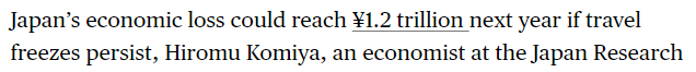 文章援引日本综合研究所经济学家小宫弘(Hiromu Komiya)的话表示,随着中国农历新年临近,预计日本的温泉、滑雪胜地等冬季热门旅游项目可能会遭冷遇。如果这种情况持续下去,日本2026年的经济损失可能达到1.2万亿日元(约合541亿元人民币)。