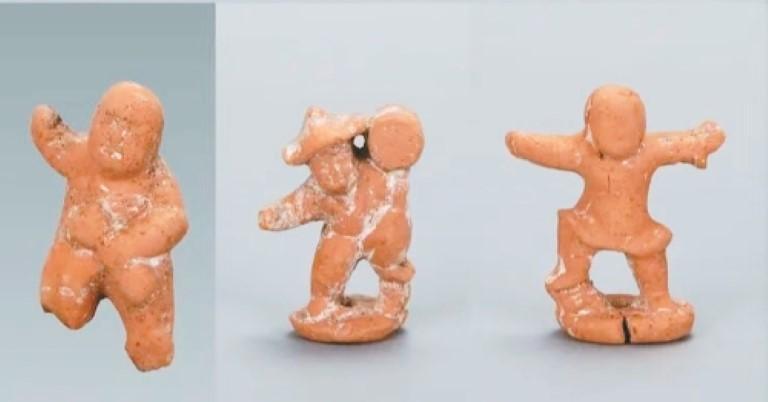 这些陶俑体量小巧,通高在5-5.8厘米之间,但姿态刻画精细。它们均为竿上的表演者,俑身底部或所踏的椭圆形踏板中间,均留有清晰的圆形插孔,用于安装(已朽坏的)竿木。从造型看:有的双臂平举,单腿立于踏板之上,仿佛正寻找平衡;有的头戴尖顶圆帽,身体侧倾,一手托举物体,姿态灵动;有的虽部分残损,但仍能看出其高举手臂、手握器械的表演瞬间。