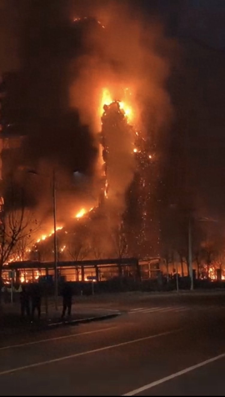 现场视频显示,一栋高层建筑燃起大火,大量浓烟腾空而起,建筑外部附着物因剧烈燃烧坠落地面。