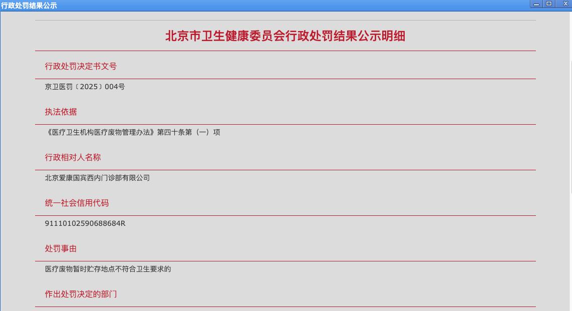 红星新闻记者在北京市卫健委官网看到了该处罚公示,该公示发布于11月14日,处罚时间为11月13日,北京爱康国宾西内门诊部有限公司因“医疗废物暂时贮存地点不符合卫生要求”被处以警告和罚款。