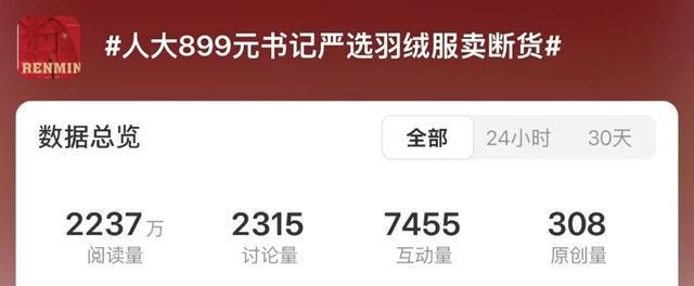 12月12日,#人大899元书记严选羽绒服卖断货#登上微博热搜,阅读量达2237万(截至发稿),讨论互动量过万。