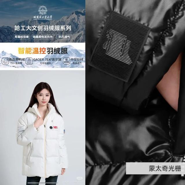 二是名校背书。哈工大、北电等高校凭借专业特色,为羽绒服注入科技或文化内涵。如哈工大羽绒服采用智能温控技术与可呼吸面料;北电羽绒服则设计有蒙太奇光栅、专属校徽拉链头等细节,凸显学校特色。