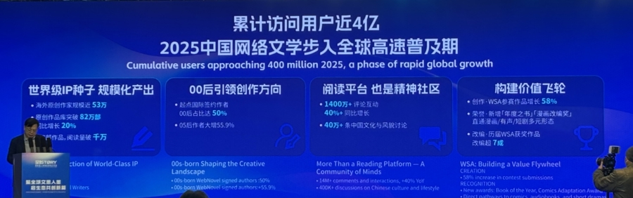 中国网络文学的全球影响力,正在攀升至新高度。WebNovel(起点国际)作为重要平台,截至2025年11月1日,全球累计访问用户量已超4亿,52.9万名作家共同创作了超82万部作品,作品总量较去年同比增长20%,其中,阅读量破千万级的爆款已达538部。