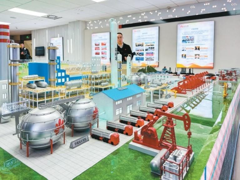 “把工业排放的二氧化碳‘抓’起来、用起来、存起来,既守住了减排底线,又稳住了生产大盘。”在延长石油CCUS展示中心,一块精细的沙盘模型直观展示了“低渗致密油藏二氧化碳利用与封存一体化关键技术”这项硬核减碳技术的实际应用场景——延安安塞杏子川采油厂化38注气站。“我们在这里打造了‘CCUS+新能源’模式。”延长石油CCUS研究中心高级工程师王苛宇介绍,该项目区每年可注入36万吨二氧化碳,相当于植树324万棵,节水108万立方米;配套的风光发电项目年发电320万千瓦时,可满足示范区日常用电需求。通过捕集煤化工排放的二氧化碳并用于驱油封存,实现了经济效益与生态效益的双赢。