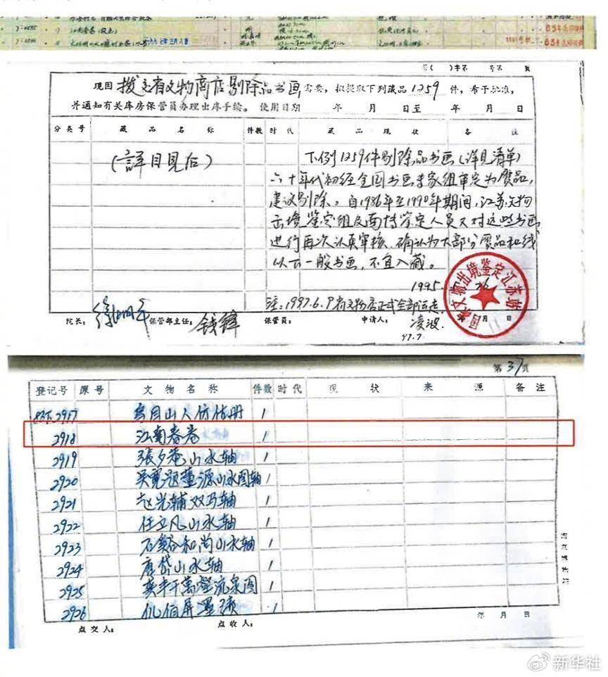 新华社记者经采访得到了《江南春》图卷从划拨、调剂、退藏、销售的相关史料。1986年6月,原文化部制定出台《博物馆藏品管理办法》。之后,南京博物院依照此办法,由原江苏省文物出境鉴定组及南博鉴定人员对一批建议剔除的书画作品进行再次审核,确认不宜入藏。1997年4月15日,南京博物院向原江苏省文化厅提交《关于处理不够馆藏标准文物的报告》,请求“将不够馆藏标准的文物(即博物馆的处理品)进行调剂,价拨给省文物总店处理”。原江苏省文化厅于1997年4月21日同意调剂。1997年5月8日,被专家认定为赝品的《江南春》图卷拨交给原江苏省文物总店,于2001年4月16日被“顾客”以6800元价格购买,销售清单明示为《仿仇英山水卷》。