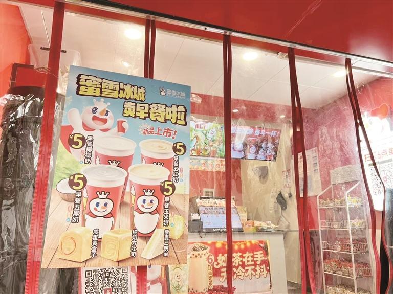 12月22日,记者先后探访了西安市区近10家蜜雪冰城门店,覆盖高校周边、社区底商、商圈临街等多种业态。在西安南郊的光华路上有两家蜜雪冰城门店,路南门店店员称暂没有上早餐。在路北的门店记者看到,透明门帘上张贴“蜜雪冰城卖早餐啦”的海报。