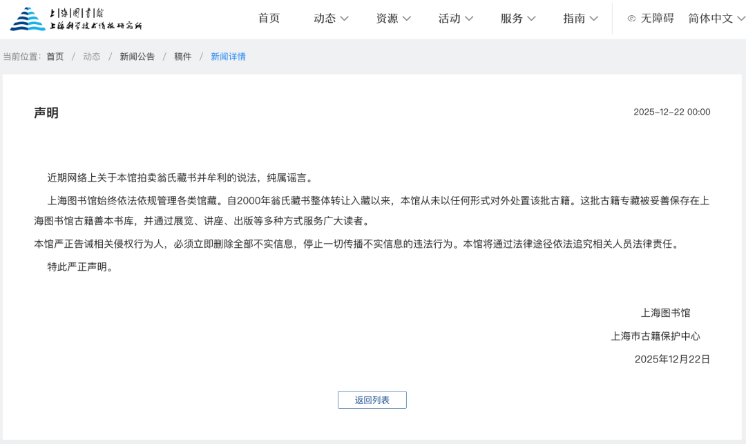 12月22日,上海图书馆发布声明: