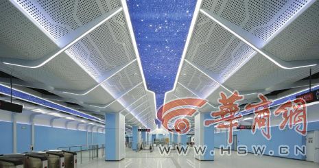 航天城站作为装修特色站,是15号线和2号线的换乘车站,装修设计主题为“慧聚云端、展翼载梦”。提取腾飞的翅膀作为空间设计元素,天花板采用铝方通结合冲孔铝板,以阵列组合的形式出现,犹如大鹏展翅,寓意自由、力争向上。中部透光膜布模拟出星空的效果,结合蓝色烤瓷铝板墙柱面,天地墙一体化整体设计,科技感十足。换乘通道结合航天科技画面展示,预示着西安科技与航天事业的蓬勃发展。